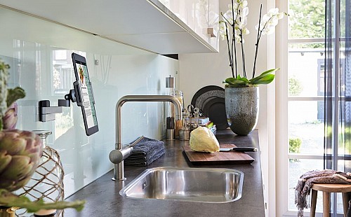 At Vogel's, we love to use our tablet in the kitchen while cooking a meal. So, for maximum enjoyment, our designers drew upon their experience to create sturdy, flexible tablet holders and tablet mounts that fix tablets securely to walls. It won't take up counter space and will keep your tablet safe from splatters.