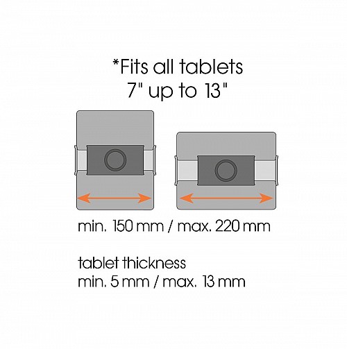 The stylishly designed Vogel's tablet holder fits all tablets from 7-13 inches in length (including iPad Pro) with a thickness of 0.2-0.5 inches (0.5-1.3 cm).The Tablet Flex Pack comes with a tablet holder and a flexible tablet mount, which is everything you need to use your tablet in the kitchen.